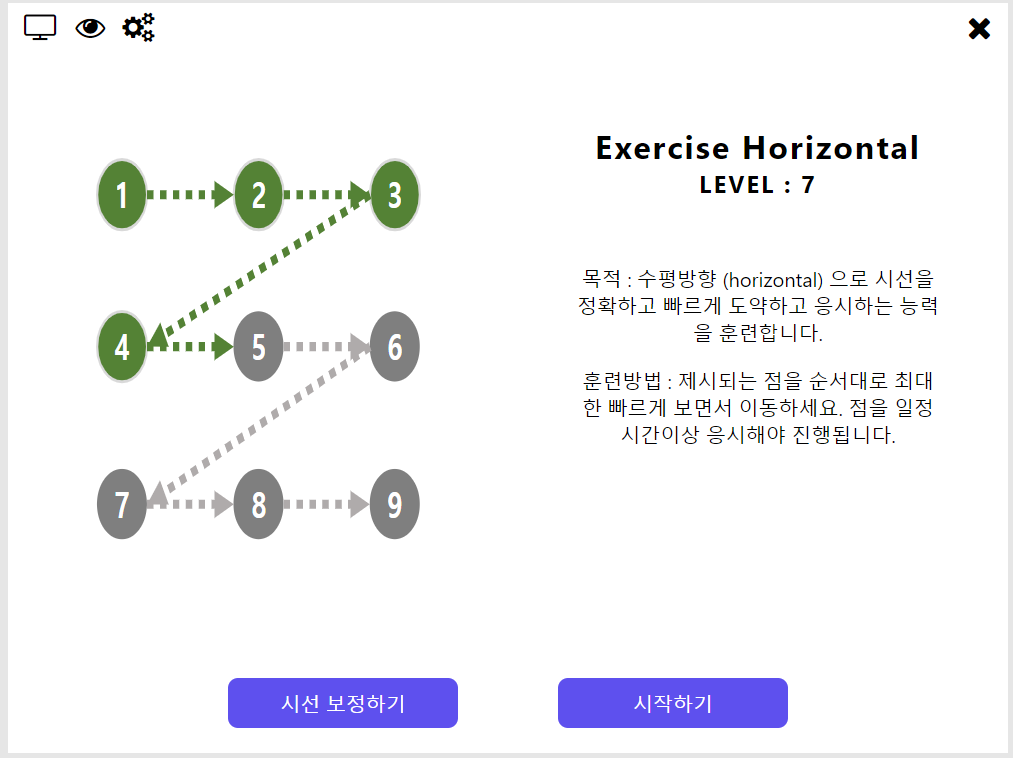 수형방향으로 시선 도약을 빠르고 정확하게 수행하는 연습을 합니다.